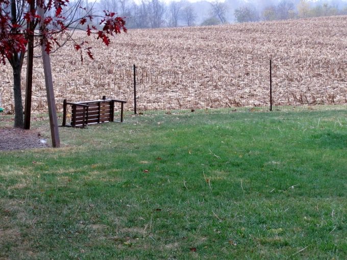 In the backyard a bench was blown over,