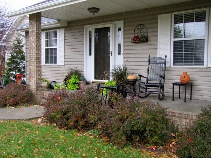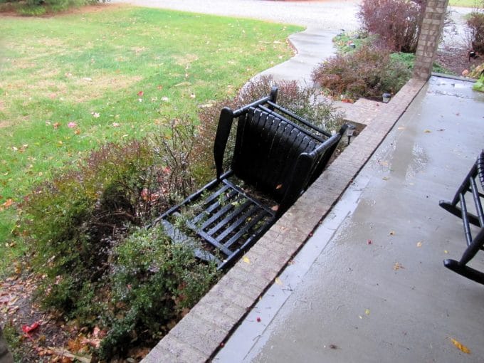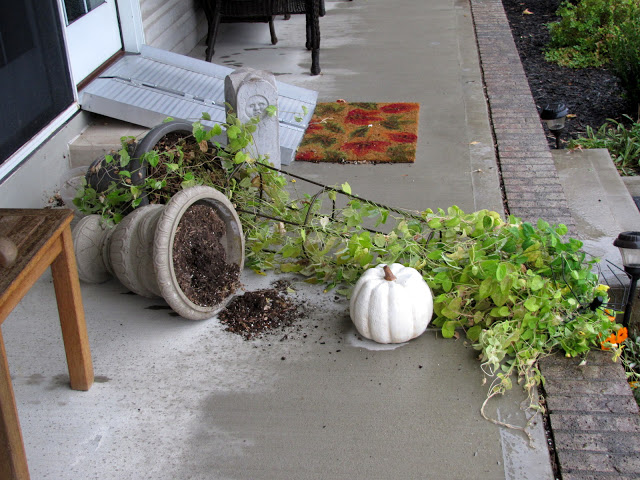Next thing I know, one of the gourds that I had in the iron basket by the front door flew past me and one of the rocking chairs jumped off the porch and landed in the bushes. And when I say jumped off, it's not like it scooted across the porch being blown by the wind, it literally was picked up and dropped in the bushes.